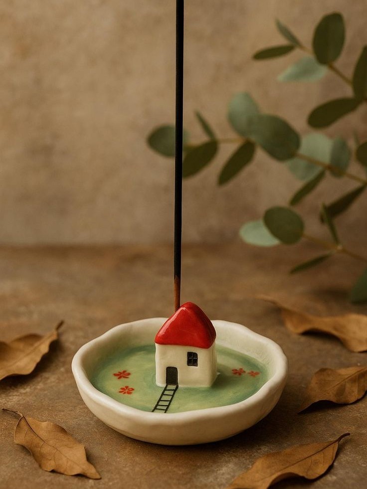 This handcrafted incense holder brings a sense of quiet countryside charm to your space. At its center stands a tiny house with a bright red roof, set inside a shallow dish glazed in soft meadow green and adorned with delicate floral accents. Each piece is sculpted and painted by hand, making every cottage slightly unique , just like a real handmade treasure. Designed to catch ash cleanly while adding warmth to your room, this incense holder is perfect for slow mornings, mindful moments, or simply decorating your shelf with a touch of cozy whimsy. A lovely piece for collectors, homebodies, and anyone who loves gentle handmade details.