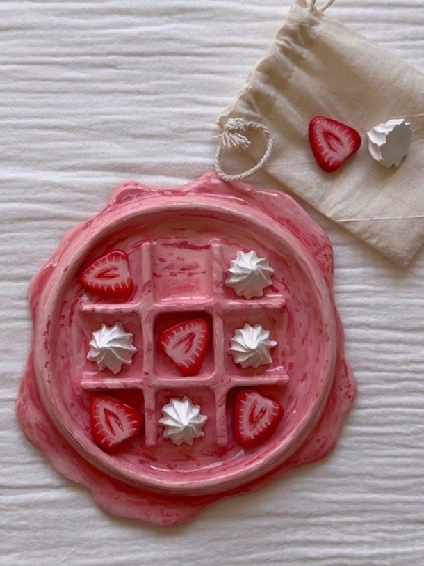 This handcrafted tic tac toe set brings the sweetness of strawberry cake into a tiny, interactive clay creation. Each piece is shaped and painted by hand, featuring soft pink tones, creamy details, and charming dessert inspired accents. Whether displayed on your desk, shelf, or coffee table, it adds a delightful blend of playfulness and aesthetic charm. Lightweight and durable, it’s a perfect gift for dessert lovers, collectors, or anyone who enjoys cozy handmade art. A small game designed to bring joy, warmth, and a touch of sweetness to your space.