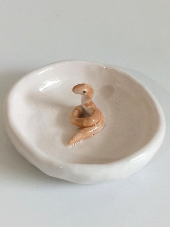 A charming tiny snake trinket dish crafted by hand to hold your rings, keys, or little treasures.